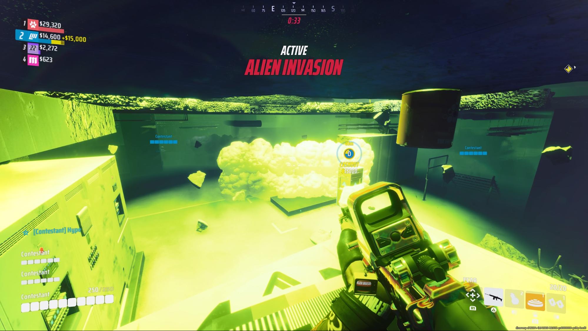 Nun kommt der Haken: Die anderen Teams können den Cashout für sich beanspruchen, wenn sie es innerhalb der ablaufenden Zeit schaffen, zur Cashout-Station zu gelangen und das Geld zu stehlen. Hierzu muss man nah an die Station herantreten und eine Taste gedrückt halten. Das Stehlen des Geldes dauert einige Sekunden und kann beliebig oft von den Teams vollzogen werden, solange der Cashout-Vorgang noch nicht vollständig abgeschlossen ist.