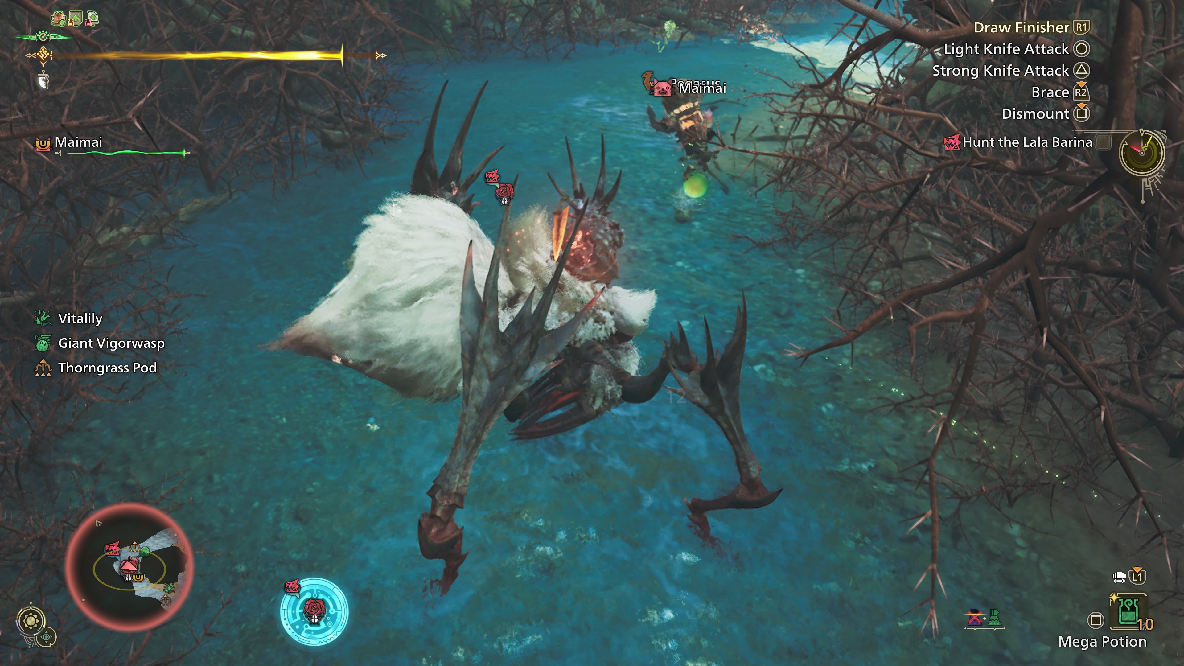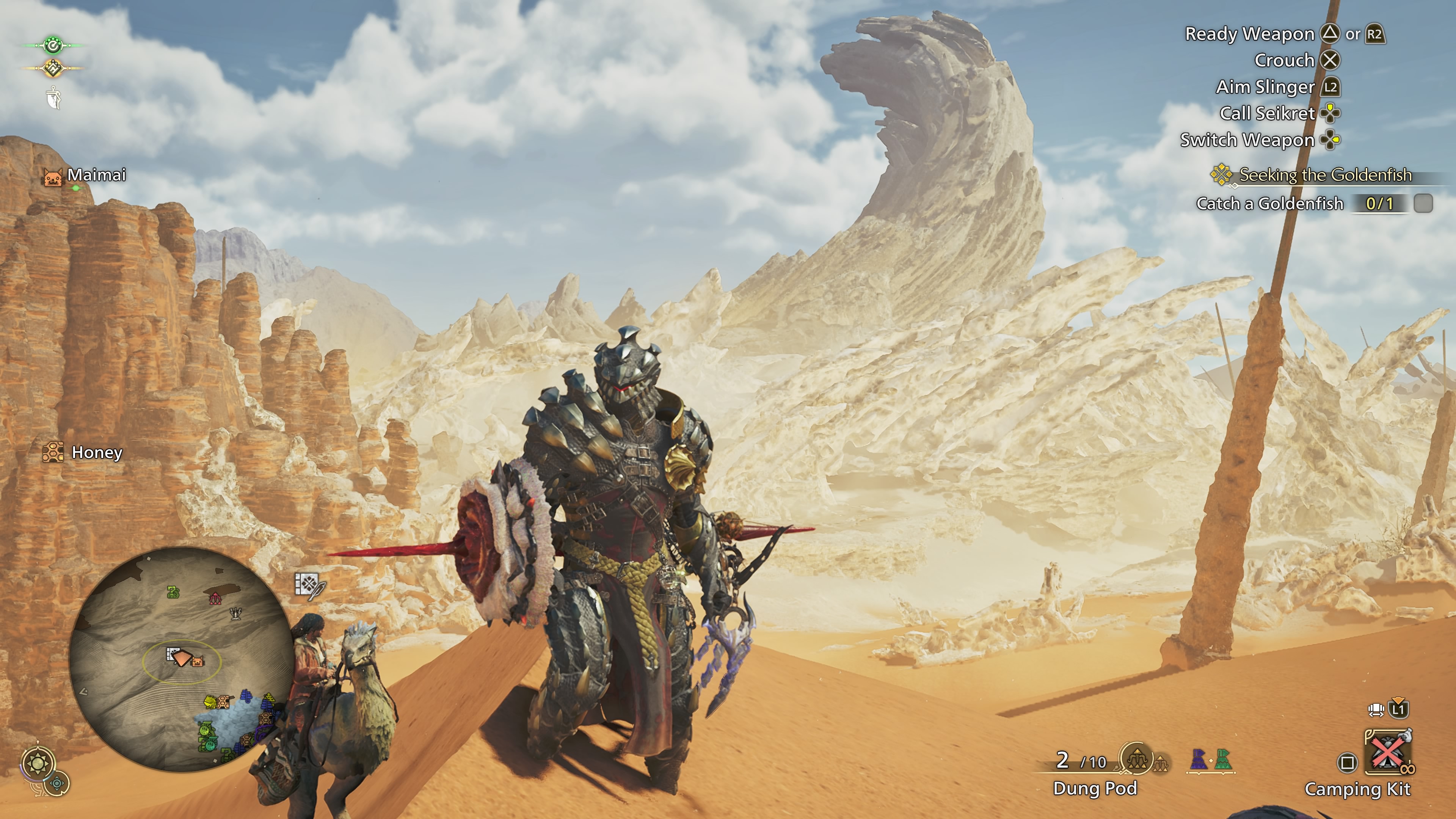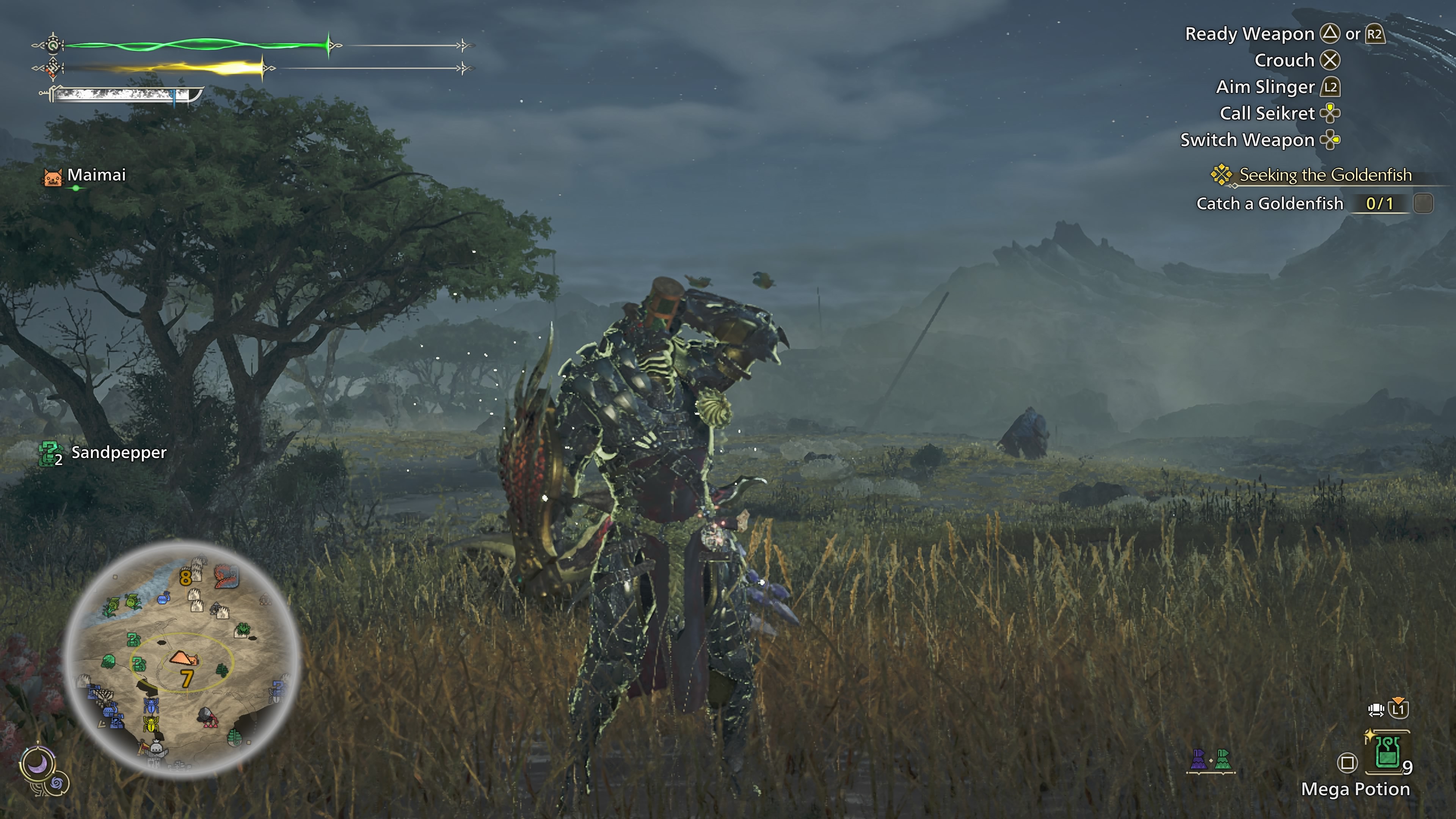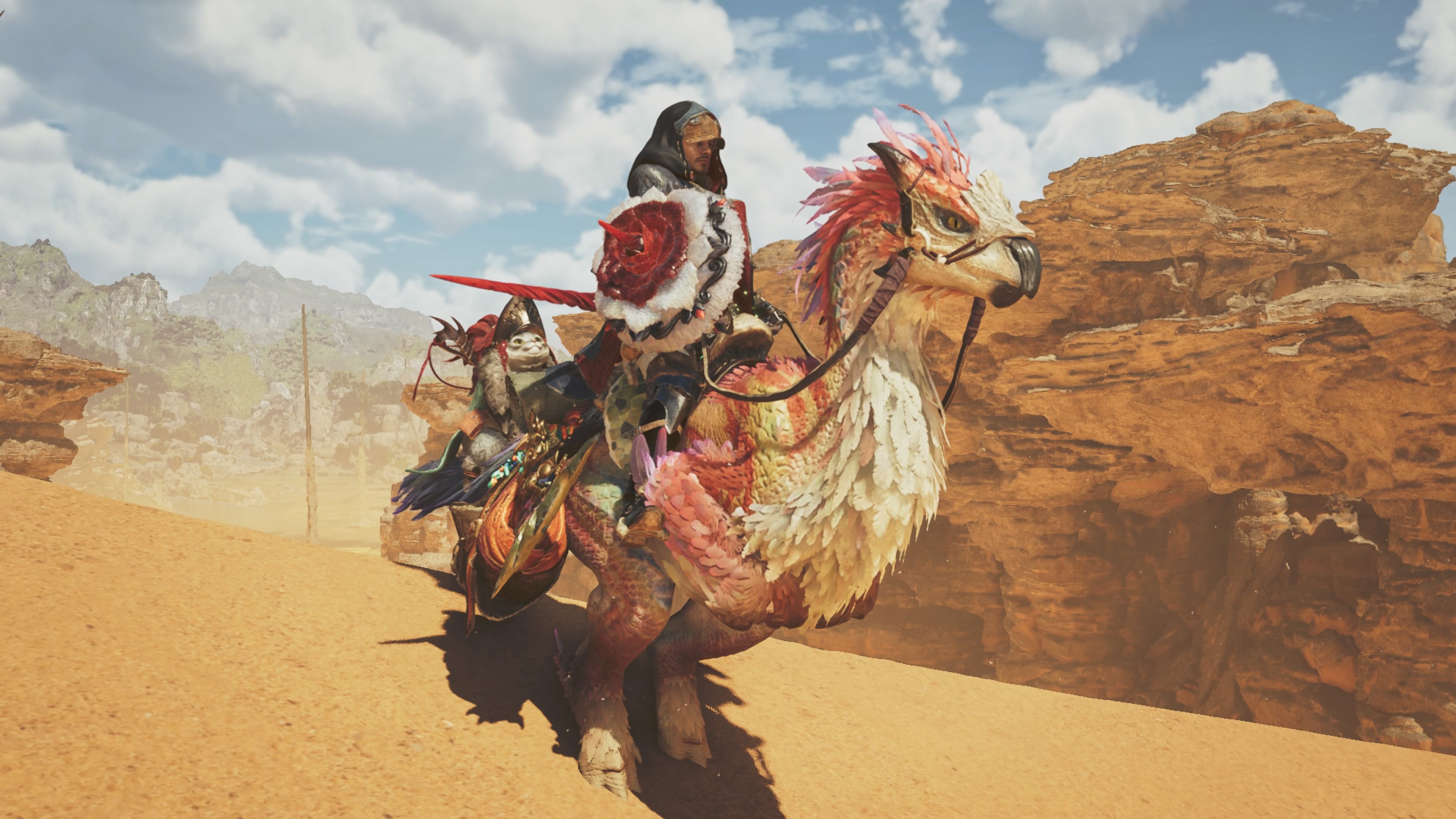 Für die Erkundung aber auch im Kampf steht uns unser treues Saikrii zur Verfügung. Dabei handelt es sich um einen vogelartigen Zweibeiner, der an Chocobos aus Final Fantasy erinnert. Auf ihm können wir uns schnell durch die Welt bewegen und zu markierten Orten bringen lassen. Praktisch ist dabei nicht nur, dass wir uns mitten im Kampf von ihm aufsammeln lassen und Items konsumieren können. Wir können nämlich auch eine Zweitwaffe in seiner Satteltasche verstauen und auf Knopfdruck jederzeit zu ihr wechseln. Das ermöglicht ganz neue Herangehensweisen an die Kämpfe.