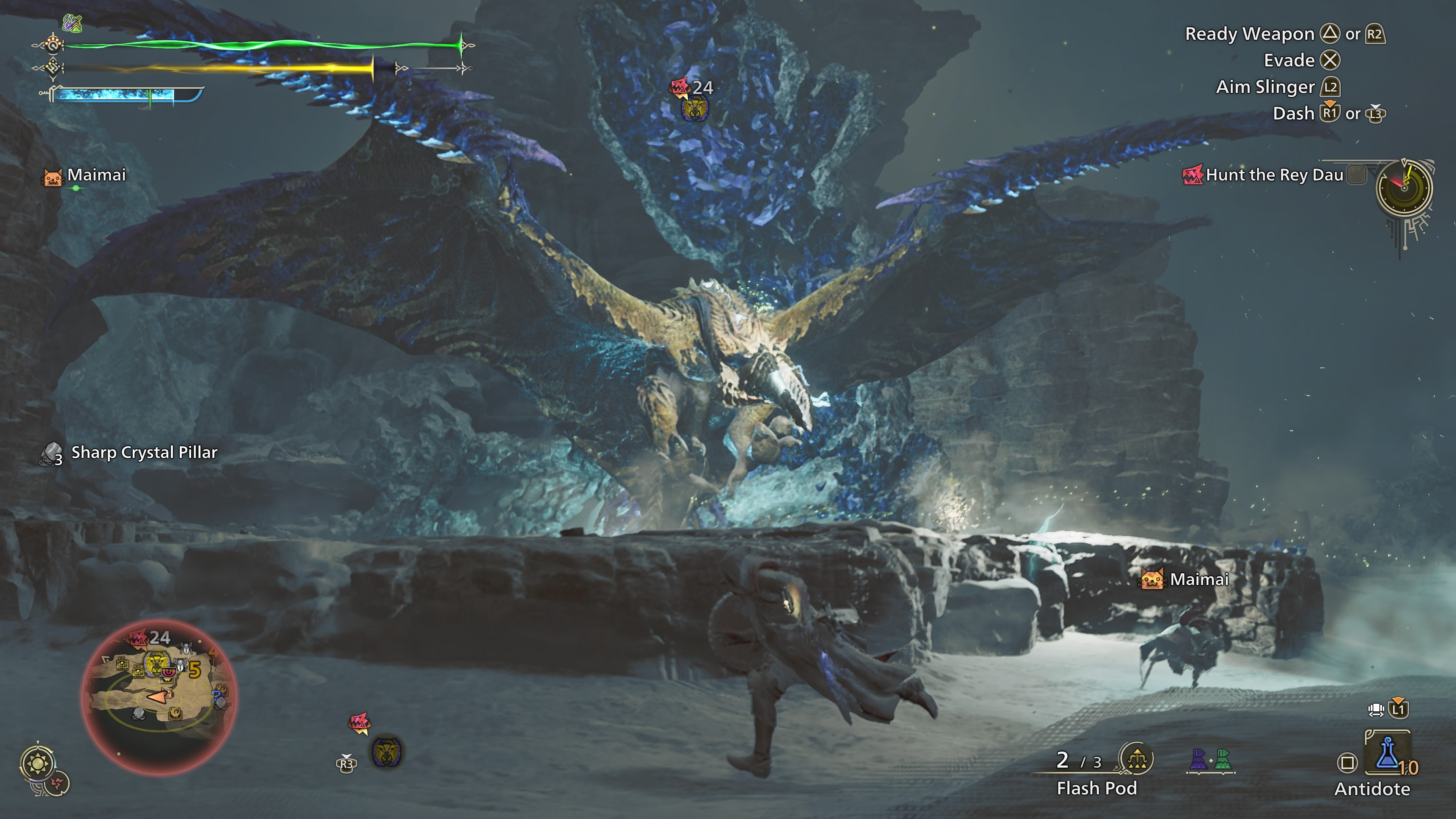 Die Kämpfe sind ohne Frage das Highlight von Monster Hunter Wilds. In einer vorgegebenen Zeit müsst ihr das riesige Monster erlegen oder Fangen. Dafür stehen euch zahlreiche Angriffskombinationen durch die Waffen und eine breite Palette an Items zur Verfügung. Z.B. lassen sich Monster durch Blitzbomben blenden oder durch Fallen zeitweise festsetzen. Aber auch klassische Heiltränke und Items, die eure Werte steigern sind mit von der Partie – Prost!