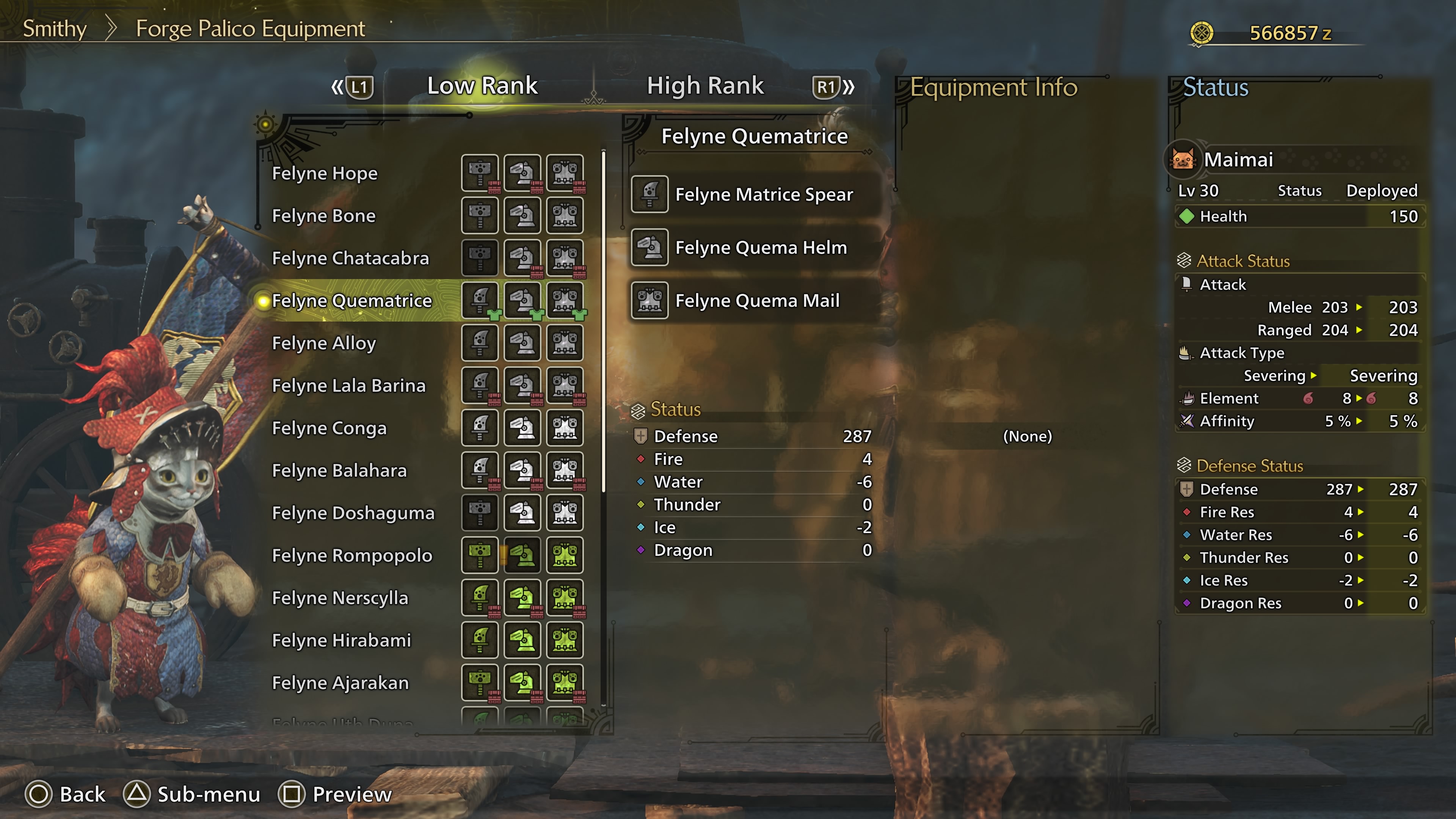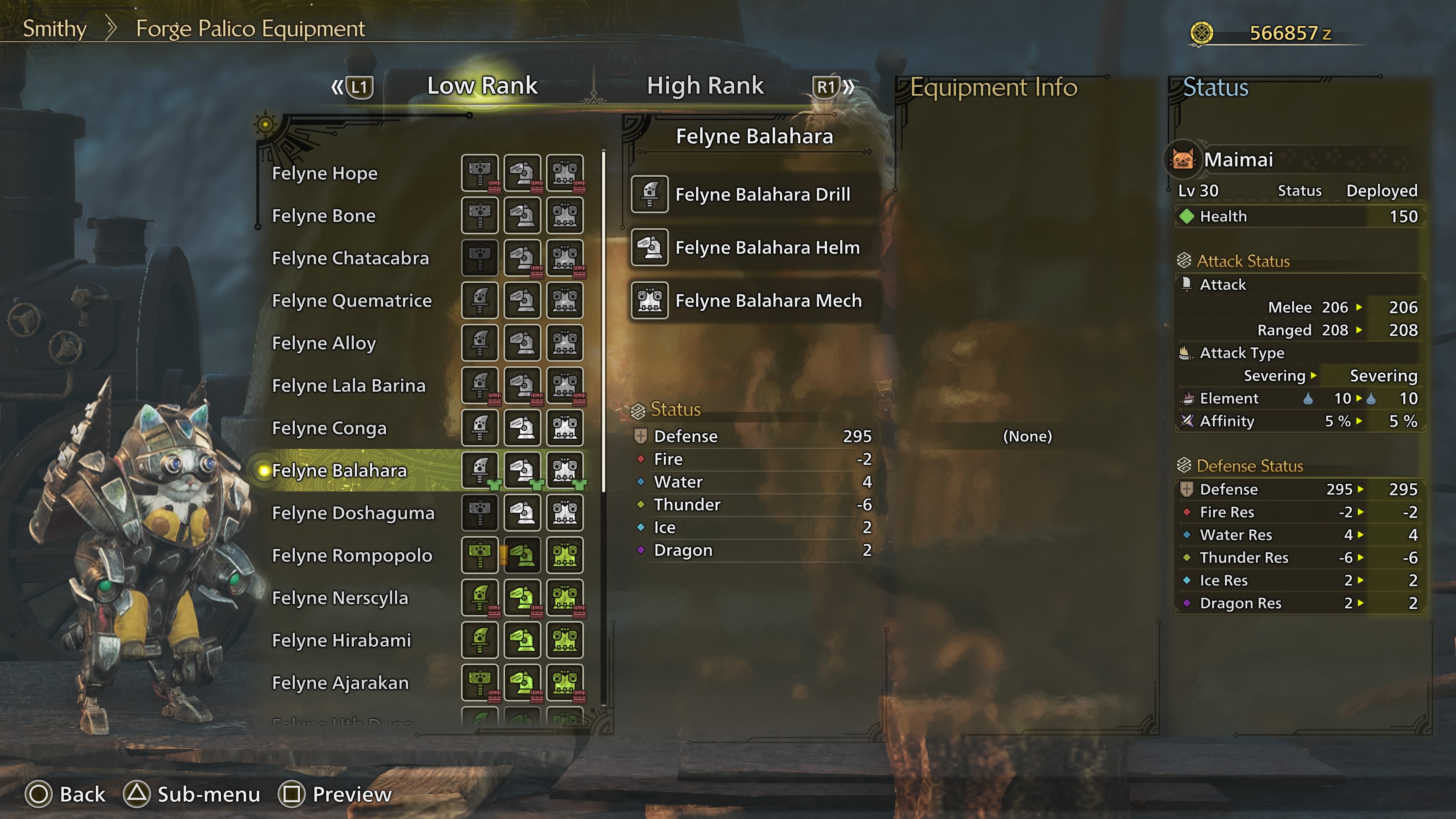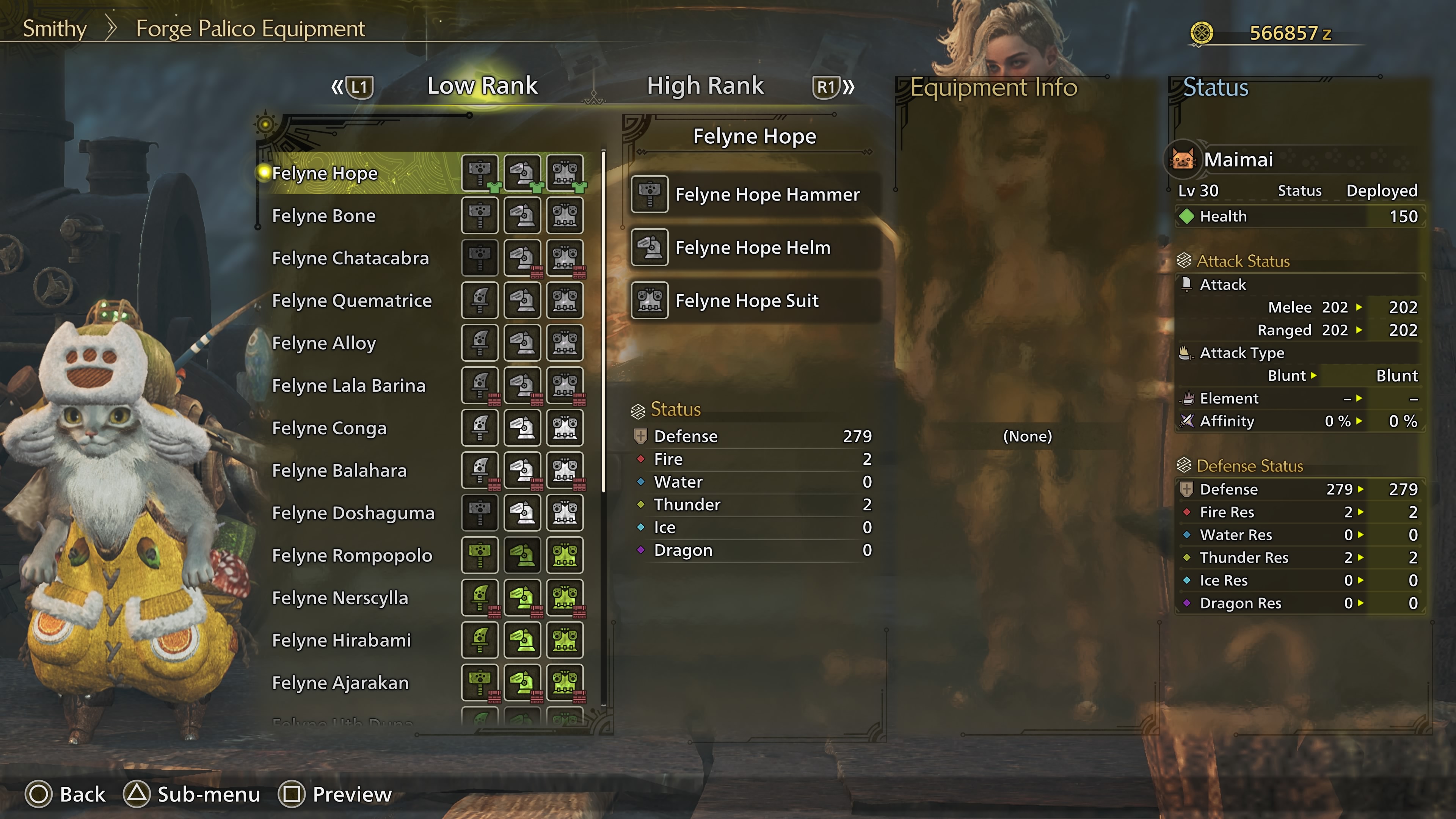Aus den Materialien von erlegten Monstern, wie z.B. Hörnern oder Hautfetzen, könnt ihr bei der Schmiedin Gemma neue Ausrüstung herstellen. Nicht nur spiegeln die Rüstungsteile die jeweiligen Monster ansehnlich und mit viel Liebe wieder, auch geben sie euch mächtige Fähigkeiten. Das reicht von einer einfachen Erhöhung von Resistenzen bis hin zu komplexeren Mechaniken, wie der Angriffssteigerung nach einem perfekten Block. Auch für euren treuen Palico kann man knuffige Ausrüstung herstellen, die mit eigenen Werten und Elementen daherkommen.