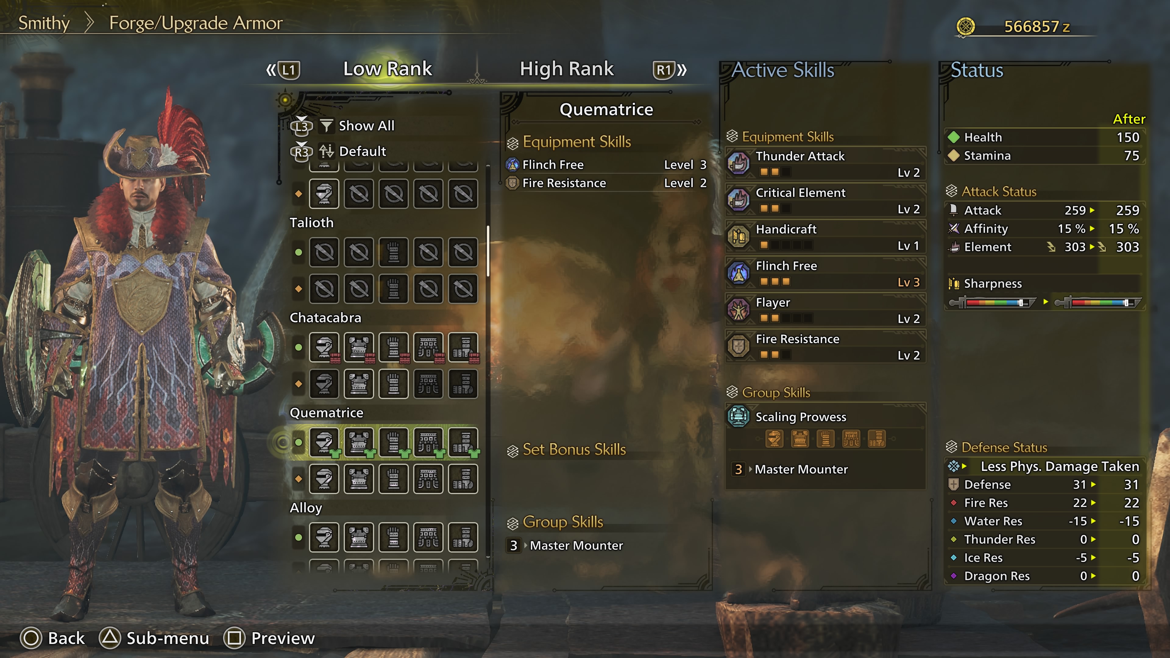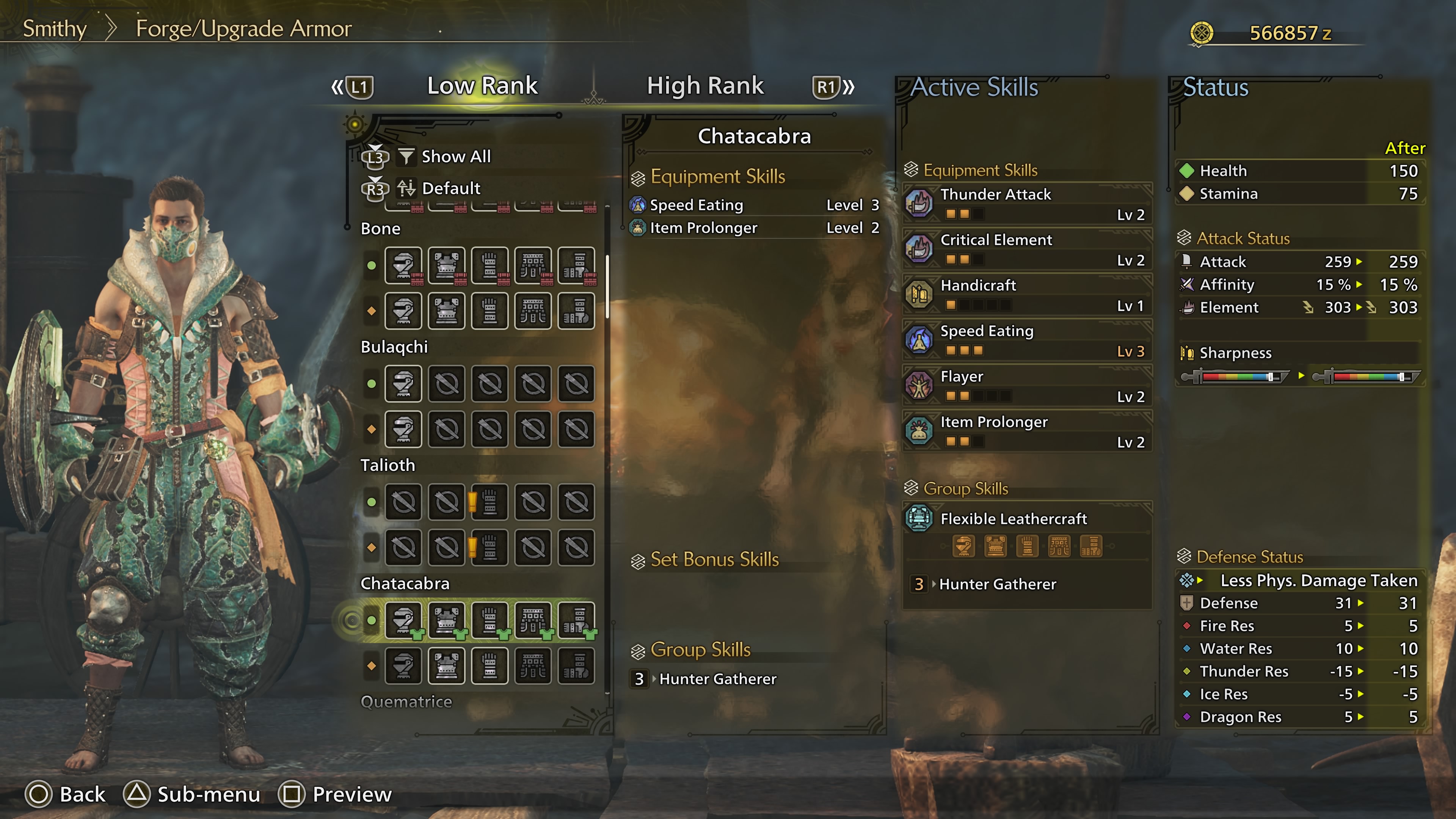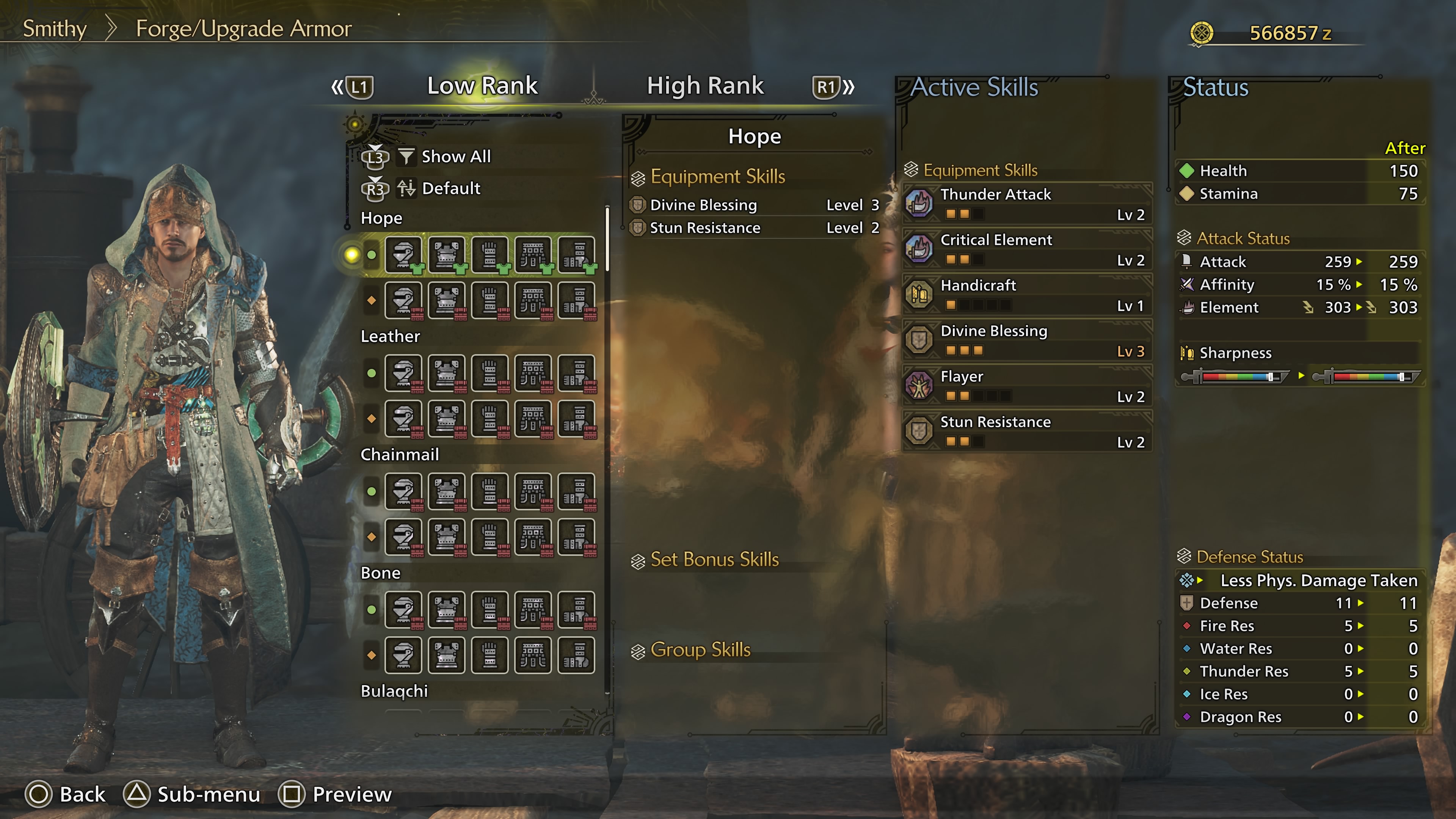 Aus den Materialien von erlegten Monstern, wie z.B. Hörnern oder Hautfetzen, könnt ihr bei der Schmiedin Gemma neue Ausrüstung herstellen. Nicht nur spiegeln die Rüstungsteile die jeweiligen Monster ansehnlich und mit viel Liebe wieder, auch geben sie euch mächtige Fähigkeiten. Das reicht von einer einfachen Erhöhung von Resistenzen bis hin zu komplexeren Mechaniken, wie der Angriffssteigerung nach einem perfekten Block. Auch für euren treuen Palico kann man knuffige Ausrüstung herstellen, die mit eigenen Werten und Elementen daherkommen.